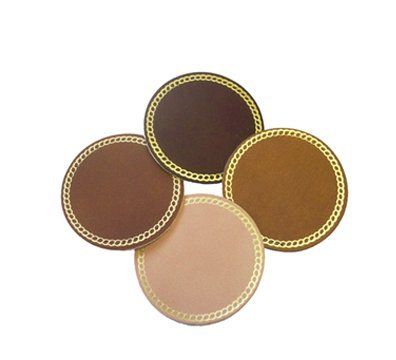 Leather coaster insert to put in the cup section of game tables and spectator chairs. Coasters have a gold embossed circular design around the edges. Adhesive backing - just pull off the protective paper and press into place.