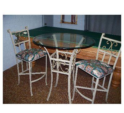 The Compton pub table has a 36" diameter round glass top and is 40" high. The base is cream colored metal with gold highlights. The chairs are the same color with the "gaming" pattern upholstered seats. The seat height is 30".