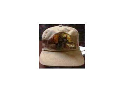 Filson "Tin" fabric hat with original "oil finish wax" treatment. Specially woven 100% cotton duck – 12.5 oz. per sq. yd. This is a heavy duty cotton fabric soaked in a paraffin-based wax and is water repellent and wind resistant. Maximum protection against rain, wind, brush and briars. The fabric is stiff but softens with use. Embroidered with the Filson name and a hunting scene – two men and their dog going hunting. We have one of these custom hats available at this special price. One size fits all.