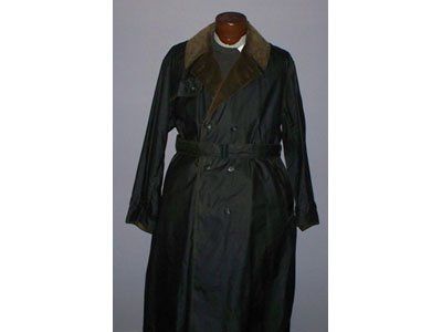 The Barbour Trench Coat is made in England. Weather-proof waxed cotton in olive green with a belted waist and brown collar and trim. We only have one of these available at this special sale price. Size C46.
