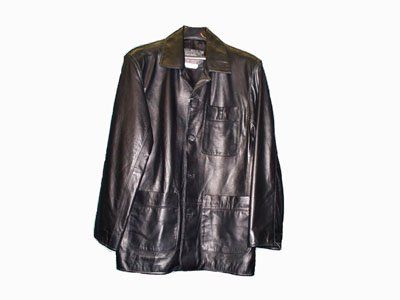 Made of soft lambskin leather. This is a button front blazer style leather jacket. Features three pockets: one left breast pocket and two large pockets at waist front. Fully lined. Designed by Laura Campbell (Paris, New York, Beverly Hills), for the former RC Designs. We have only two of these left at this special price. Men's size Medium and Large.