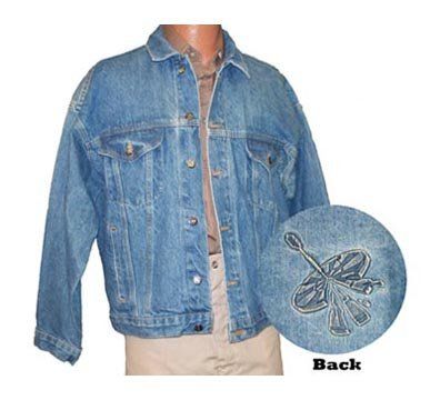 Blue denim baseball style jacket with tan sleeves and tan trim. It has the dart logo on the front left chest panel. The denim is prewashed and the color and shading from garment to garment are characteristic of the wash process. No two garments will look identical. We only have one jacket left in stock and it is a size Large.