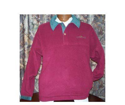 Polartec offers superior warmth without the weight, and this material is highly breathable. The Polartec pullover is versatile for use as a warm mid-layer or functional outerwear. Burgundy with dark green micro suede trim on sleeves and collar. Has two snaps at neck. We have four of these available at this special price. Sizes: (2) Small, (1) Medium, and (1) Large.