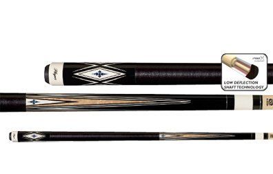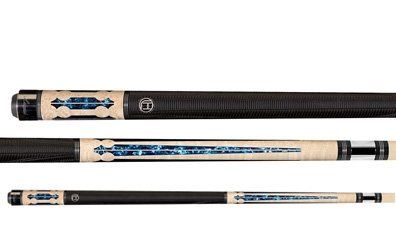 Features a Low Deflection technology shaft with a new taper designed by two-time World Champion Thorsten Hohmann, a premium 12.75mm Tiger Everest tip, and a high-tech Zero Flexpoint ferrule which drastically reduces cue ball deflection. Mystic black with a luminous blue-stained birdseye maple forearm and ebony butt with white and blue luster diamond inlays, genuine double-pressed black & blue Irish linen wrap, double nickel silver ring sets, stainless steel joint collar and Uni-Loc® quick-release joint.