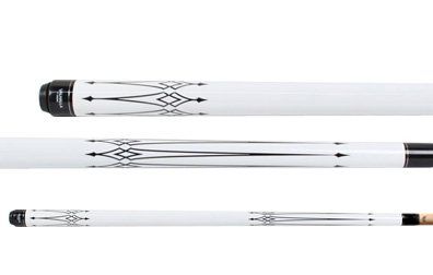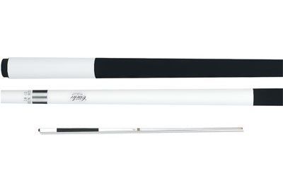 This is a one-piece Cuetec 18 oz. cue. The butt has a solid wood core covered with a white high-tech material with a non-slip grip. The warp resistant shaft is power bonded fiberglass with a super slim taper, a 13mm leather tip, and a polycarbonate ferrule. The Tru-Glide finish makes the use of hand talc unnecessary.