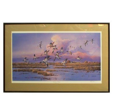 "Autumn Wings" print depicts ducks in flight on an Autumn day. Tan matte and black frame. It measures 20" high by 28" wide.