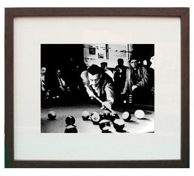 "Minnesota Fats Shooting" depicts Jackie Gleason as Minnesota Fats in the movie The Hustler. Dark walnut finished frame with white mat. Heavy hanging wire on the back. A great addition to any game room.
