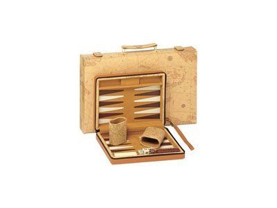 Travel size backgammon set in a tan "map design" zippered carrying case.