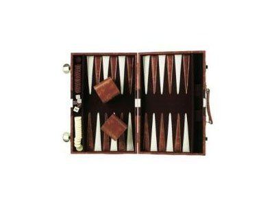Backgammon set folds in half for easy storage. Has a convenient carrying handle. Game comes with playing pieces, two leatherette cups, dice, and instructions. The case is 19"L x 18"W x 1"H when open.