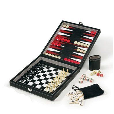 Yesterday's games for today's families! Classic 5-in-1 game set comes in a stylish 9" leatherette storage case with playing fields for chess, checkers and backgammon. Includes chessmen, backgammon pieces, checkers, 2 pairs of dice, doubling cube, 28 classic dominoes, 5 poker dice, leatherette dice cup, 3 storage bags for pieces, and game instructions. Handy addition to any game collection.