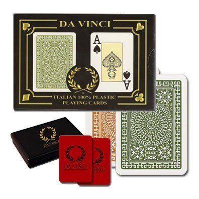 Double deck of Club Casino style Da Vinci 100% Italian plastic playing cards with jumbo numbers. Da Vinci Cards are made of 100% plastic. They are durable and washable. These cards shuffle easily and are virtually impossible to dent or mark. Includes hard shell case & 2 free cut cards.