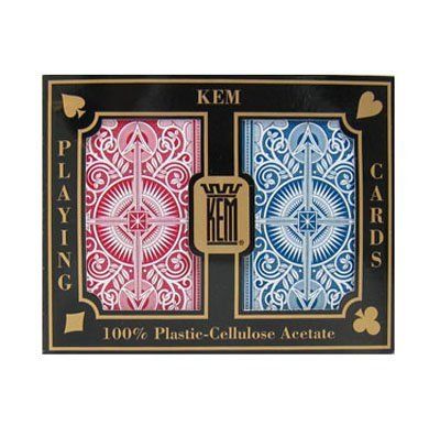 Double deck of Kem Arrow poker cards with regular numbers. Kem Cards are made of 100% cellulose acetate, which is a strong, flexible plastic. They are durable and washable. Kem cards shuffle easily and are virtually impossible to dent or mark.